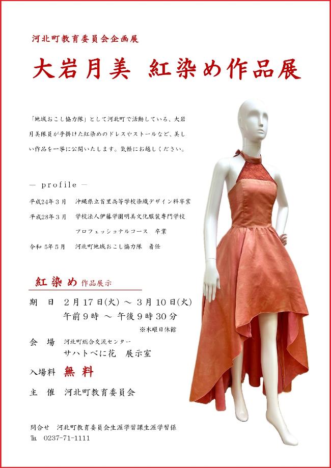 河北町地域おこし協力隊 大岩 月美氏が制作した、美しい紅染めの作品を一挙に展示いたします。